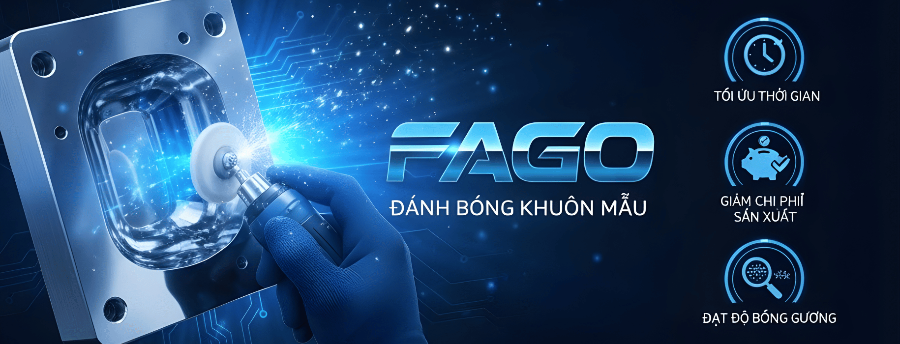 Fago là đơn vị chuyên cung cấp vật tư, thiết bị và giải pháp đánh bóng khuôn mẫu hàng đầu, được tin chọn bởi nhiều doanh nghiệp trong và ngoài nước. Với hơn 12 năm kinh nghiệm hợp tác cùng các đối tác Hàn Quốc, Fago mang đến sản phẩm chất lượng cao, quy trình chuyên nghiệp và dịch vụ tận tâm, đáp ứng mọi tiêu chuẩn kỹ thuật khắt khe của ngành khuôn mẫu. Fago cam kết “Đánh bóng chuẩn xác – Hiệu quả tối ưu – Độ bền vượt trội”, giúp khách hàng nâng tầm chất lượng sản phẩm và tiết kiệm chi phí sản xuất.